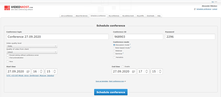 - The Schedule conference button: Schedules a meeting with the current settings for the date/time indicated in the Start time option.