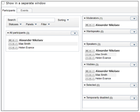 The Moderator Panel provides different moderation tools. It is intended to manage the meeting with a large number of participants.